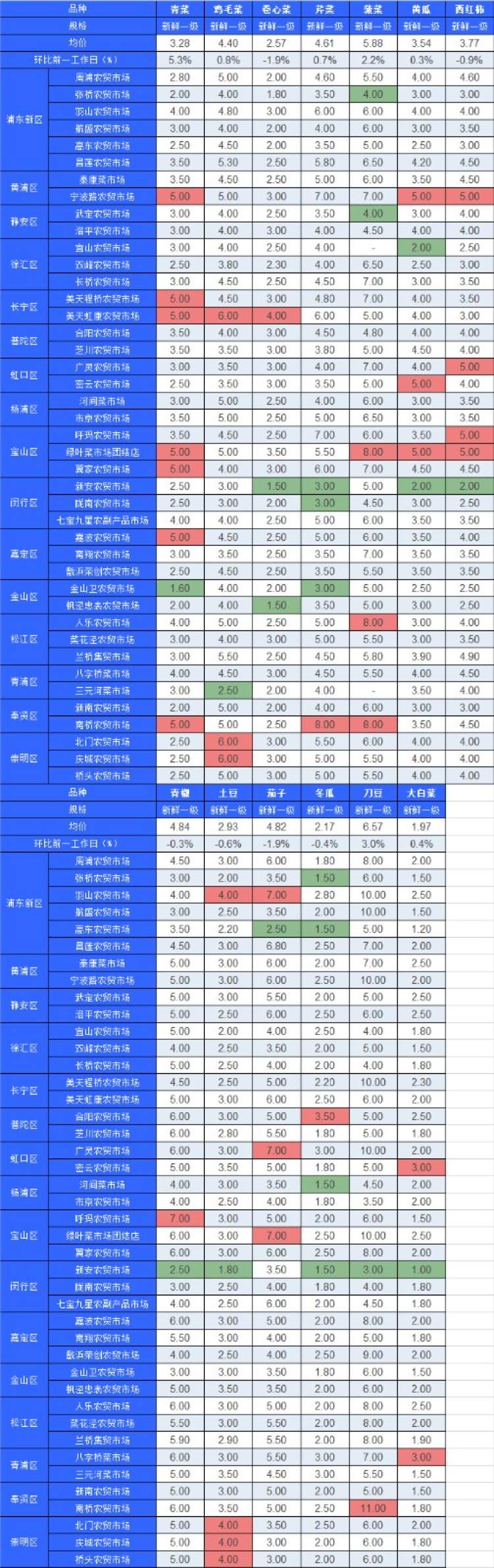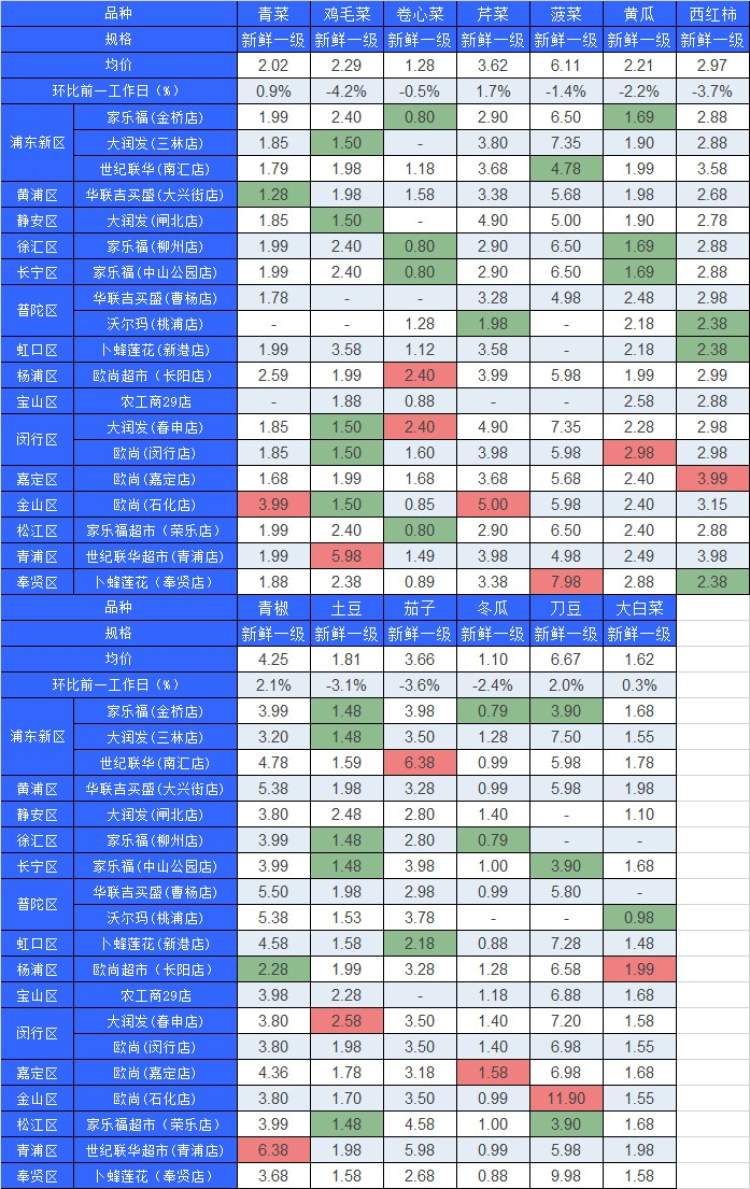 ■粉底标注代表该蔬菜品种在上述农贸市场或超市的最高价;绿底标注代表该蔬菜品种在上述农贸市场或超市的最低价