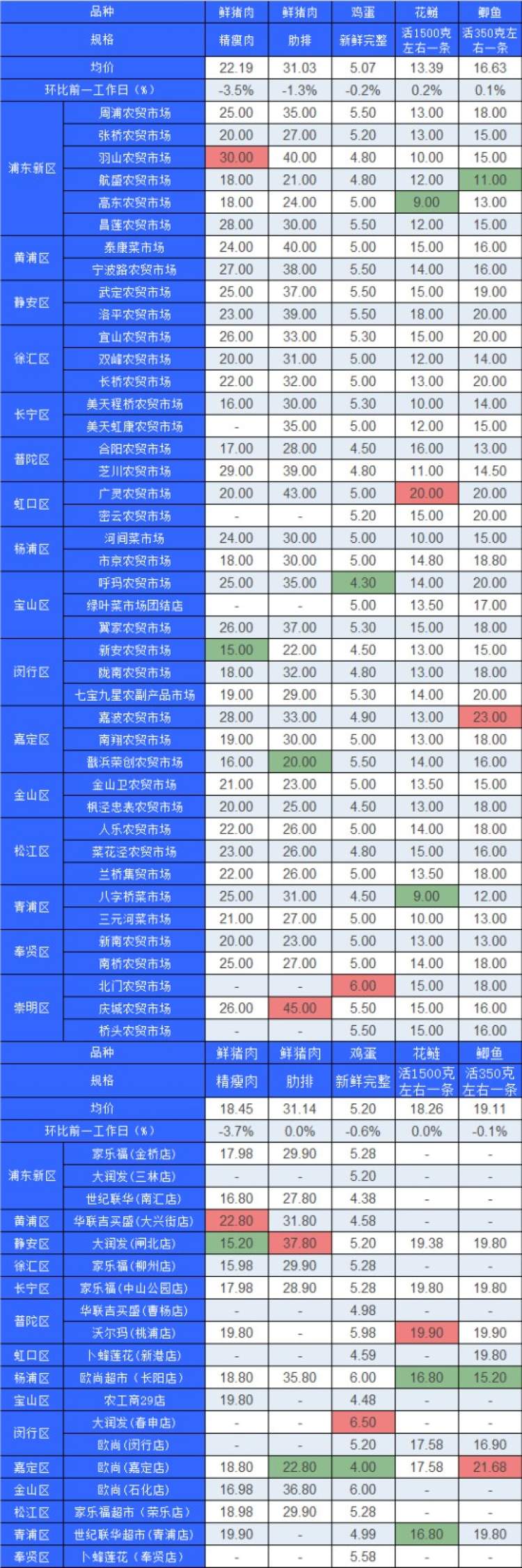 ■粉底标注代表该肉蛋鱼品种在上述农贸市场或超市的最高价;绿底标注代表该肉蛋鱼品种在上述农贸市场或超市的最低价
