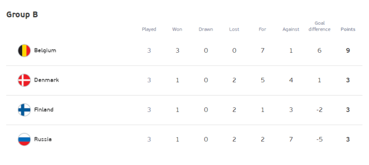 但由于三队的相互战绩为丹麦0比1芬兰、芬兰0比1俄罗斯、丹麦4比1俄罗斯,最终,丹麦凭借相互间净胜球优势,锁定B组第二名,与排名首位的比利时直接晋级淘汰赛。