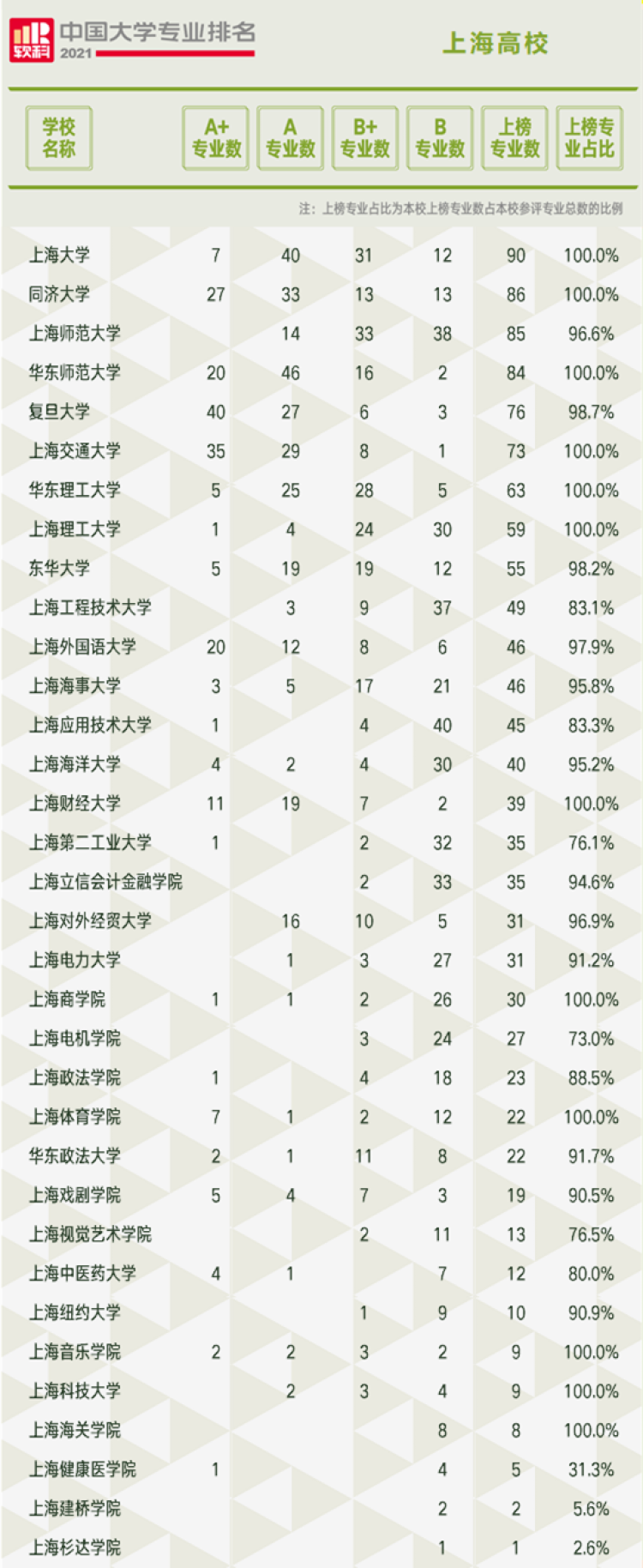 2021软科中国大学专业排名中,上海高校共有1280个专业上榜,总数位列全国第8。其中A+专业数203个,A+数量仅次于北京。