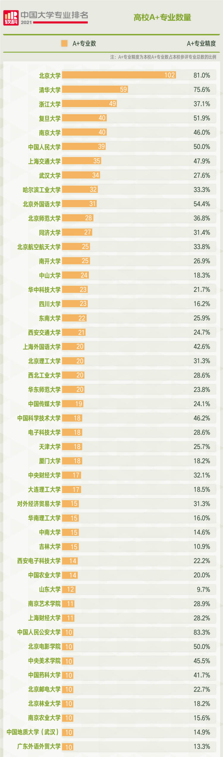 排名结果显示,北京大学以102个A+专业遥遥领先,清华大学和浙江大学分别以59个和49个A+专业数位列全国第二和第三名,复旦大学和南京大学则以40个A+专业数并列全国第四名。