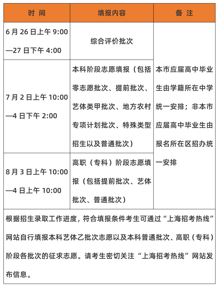 2021年上海市普通高校招生志愿填报的本科、高职(专科)阶段集中志愿填报安排如下: