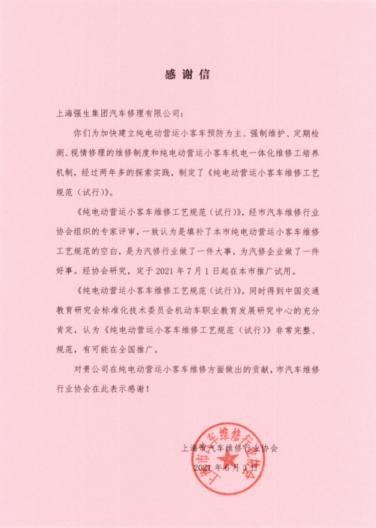 近日,上海市汽车维修行业协会向强生控股旗下强生汽修发来感谢信,对强生汽修在纯电动营运小客车维修方面做出的杰出贡献表示感谢。强生汽修制定的《纯电动营运小客车维修工艺规范(试行)》开创了行业先河,填补了本市纯电动营运小客车维修工艺规范的空白,标志着纯电动车维修保养正迈向标准化、规范化、专业化阶段。
