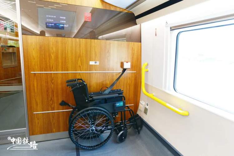8辆编组列车在4号车厢、17辆编组列车在8号车厢专门设置无障碍车厢,配备更宽阔的通过门、无障碍卫生间、轮椅放置区等,在服务设施上增加盲文标识,更好地服务残疾人旅客出行。