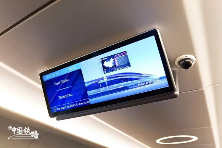 车厢顶部设置29英寸宽屏电视,可左右分屏同时显示列车运行和娱乐节目信息。