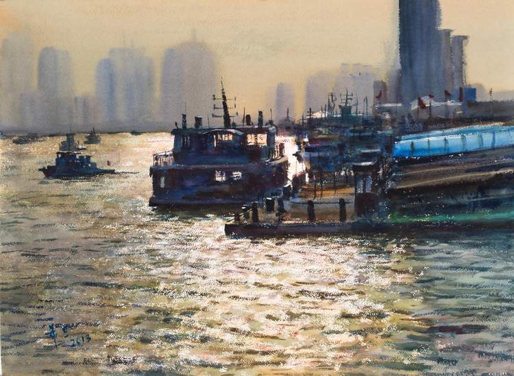 作品《浦江晨渡》从老码头的角度望去,黄浦江船来船往,冬天的太阳升起,波光粼粼的江面,轮渡、码头,让黄浦江充满了生命力。
