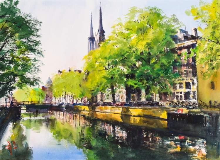 在展览第三板块“欧洲风情”展出的《金色塞纳河》中,艺术家描绘波光闪闪的水面时,利用水彩纸特殊的底纹,再辅以书法飞白式的用笔,以表现它的质感和神采,并用不同的笔触表现水的动感和层次。