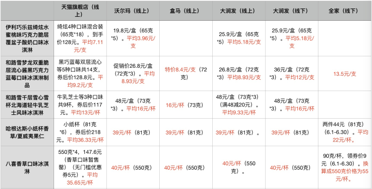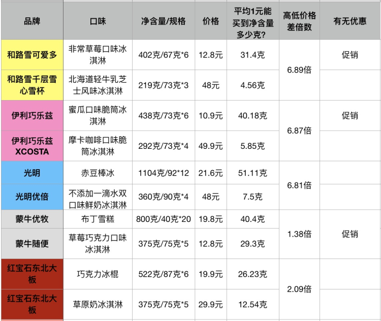 可以看见,价差最大的要数伊利巧乐兹、和路雪和光明,高低价格差倍数均超过6.8倍。