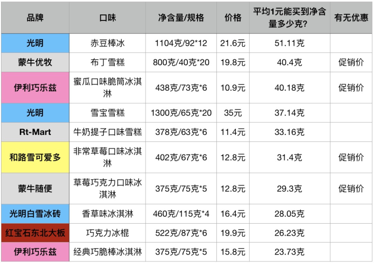 不考虑品牌溢价、包装设计等其他因素,仅从净含量克数除以单价得到“平均1元能买到净含量多少克”的结果,对同一卖场冷柜内50余种常见冷饮品牌及口味进行排名(同一品牌系列/口味数量较多时,根据不同价差选择有代表性的2-3种)。