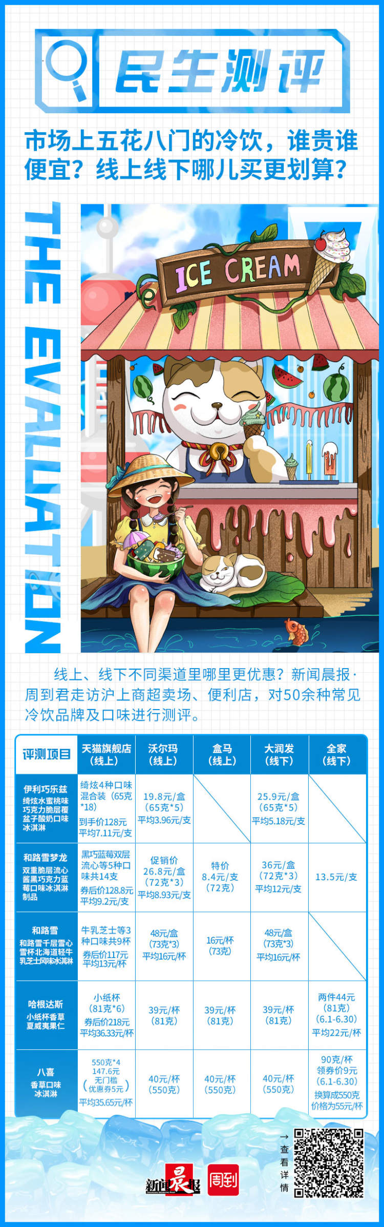 针对这些大家关心的问题,周到君走访沪上商超卖场、便利店,对50余种常见冷饮品牌及口味的规格、价格和促销情况进行记录,同时比对其在线上销售渠道的对应数据,一一寻找答案。