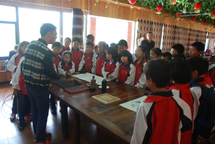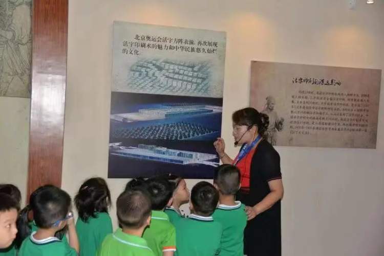 毕昇纪念馆讲解员指导小学生体验泥活字印刷