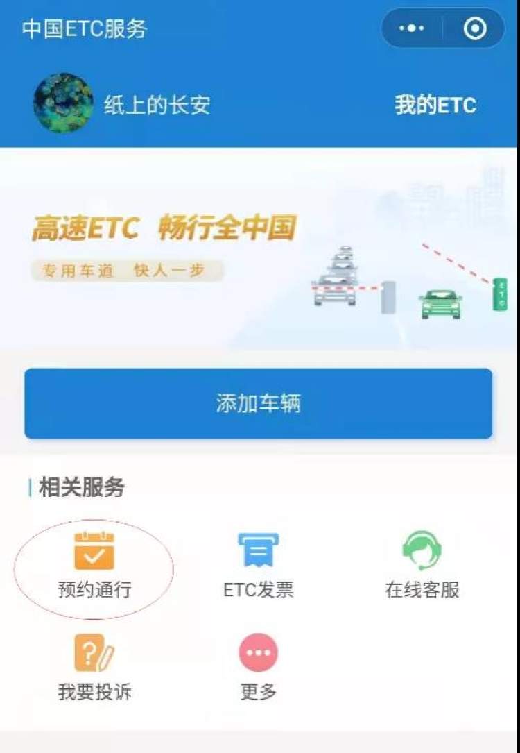 1、在微信中搜索“中国ETC服务”小程序,进入该程序后点击相关服务栏下“预约通行”;