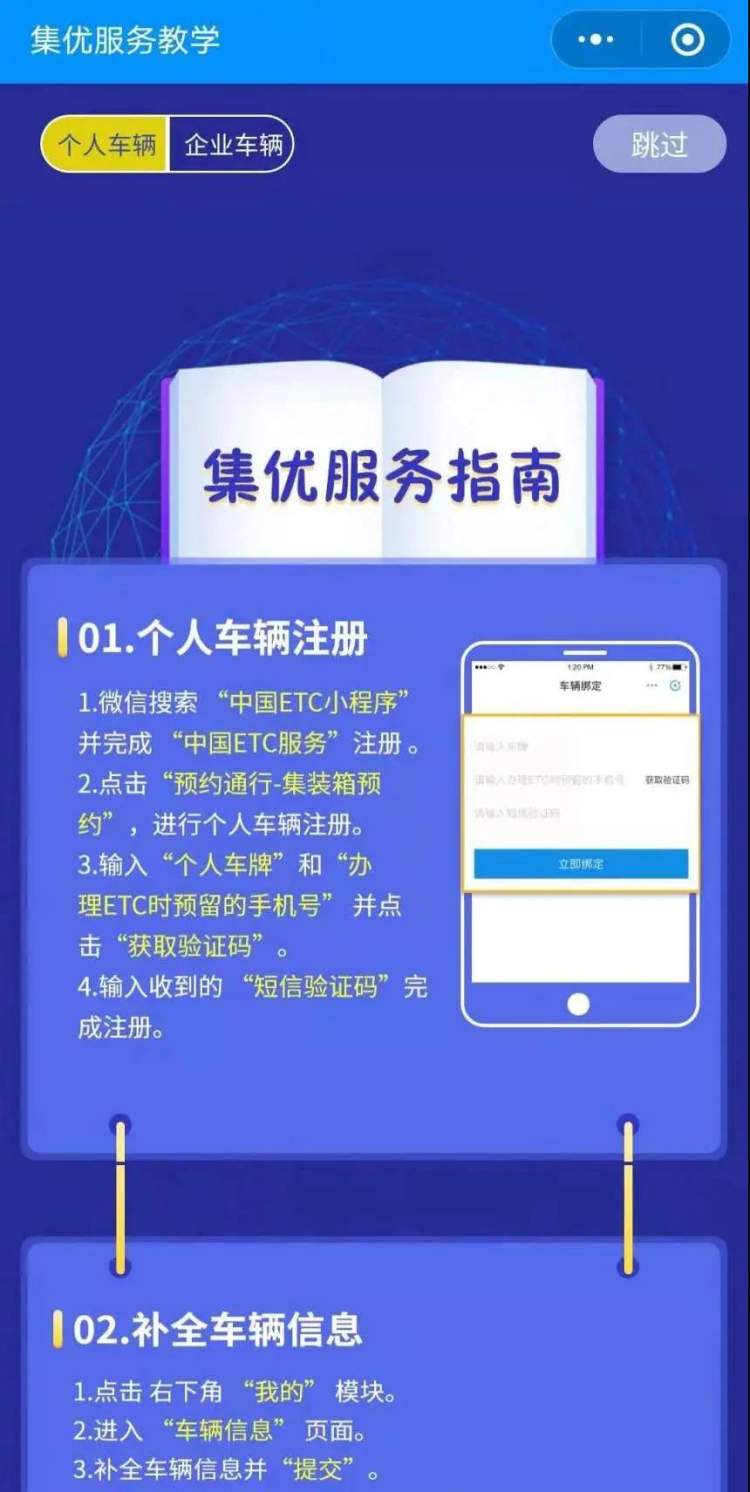 3、在“集优服务”小程序首页,点击“个人车辆”或“企业车辆”可分别查看集优服务指南,根据指南进行相关操作,完成注册。