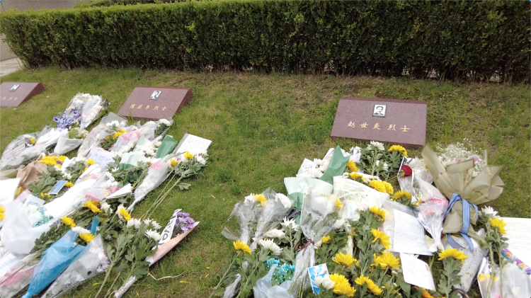 在陈延年、陈乔年、赵世炎等革命烈士的墓碑前,祭祀的人们排着队敬献鲜花并留下手写卡片,还有人留下神舟十二号载入飞船成功发射的照片告慰烈士。