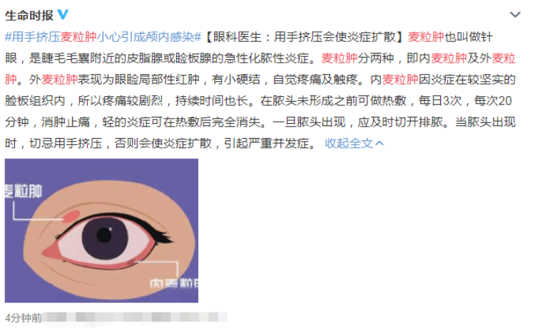 👀据生命时报微博 麦粒肿也叫做针眼,是睫毛毛囊附近的皮脂腺或睑板腺的急性化脓性炎症。麦粒肿分两种,即内麦粒肿及外麦粒肿。外麦粒肿表现为眼睑局部性红肿,有小硬结,自觉疼痛及触疼。内麦粒肿因炎症在较坚实的脸板组织内,所以疼痛较剧烈,持续时间也长。在脓头未形成之前可做热敷,每日3次,每次20分钟,消肿止痛,轻的炎症可在热敷后完全消失。一旦脓头出现,应及时切开排脓。当脓头出现时,切忌用手挤压,否则会使炎症扩散,引起严重并发症。