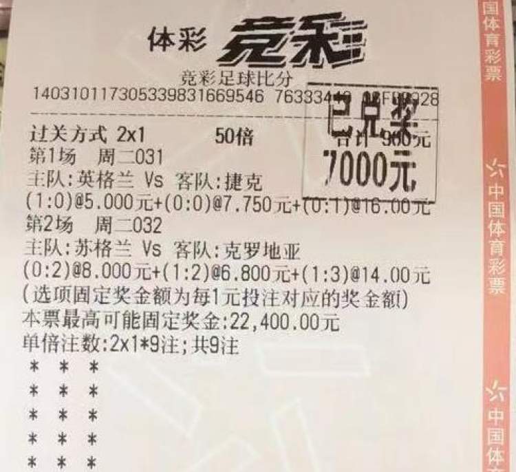 随着英格兰1:0和苏格兰1:3打出,这张投注单擒奖7000元。