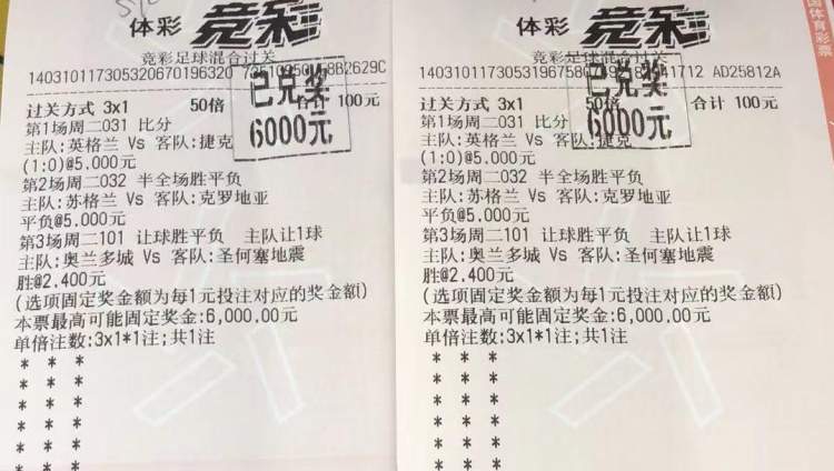 上面这两张的玩法则更混搭,购彩者选择3串1的过关方式,英格兰那场单挑1:0的比分(5倍奖金),苏格兰那场则单挑半全场的平负(5倍奖金),第三场美职足的比赛选择奥兰多让胜(2.4倍奖金,结果奥兰多5:0取胜)。这三场比赛全部打出,每张100元投入的投注单,各收获6000元奖金。