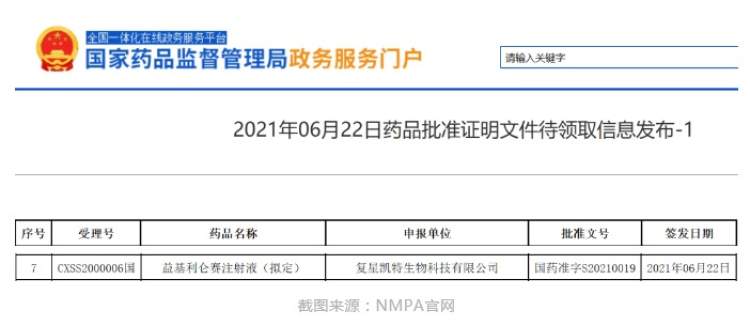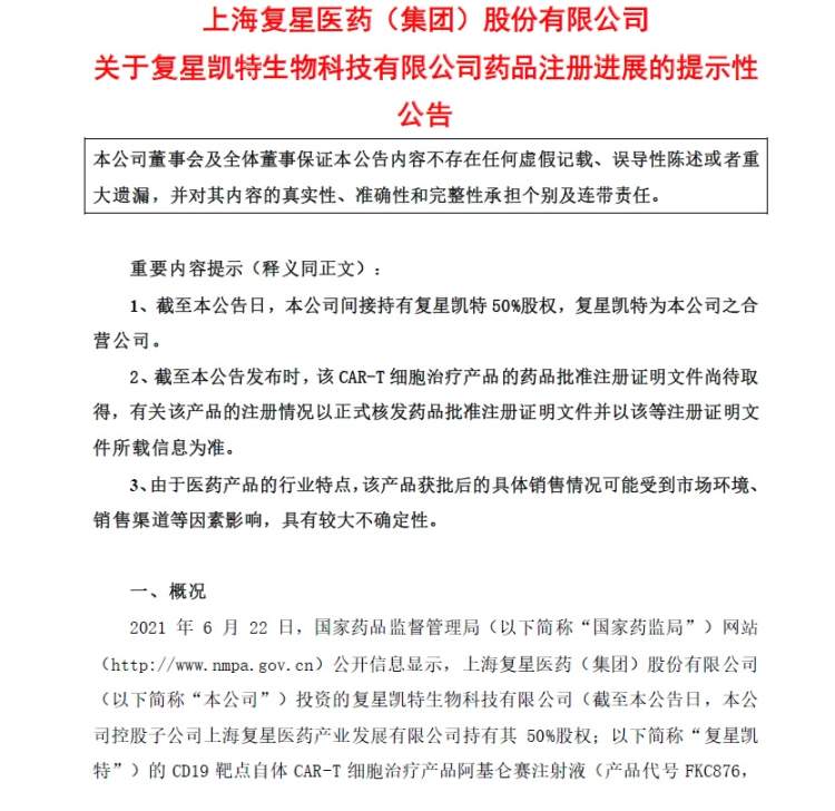 6 月 22 日,国家药监局网站公开信息显示,上海复星医药(集团)股份有限公司(600196.SH; 02196.HK)投资的复星凯特生物科技有限公司的CD19 靶点自体 CAR-T 细胞治疗产品阿基仑赛注射液(产品代号 FKC876)的上市注册审批状态更新为“药品批准证明文件待领取”。这是中国首款获批上市的CAR-T细胞治疗产品。