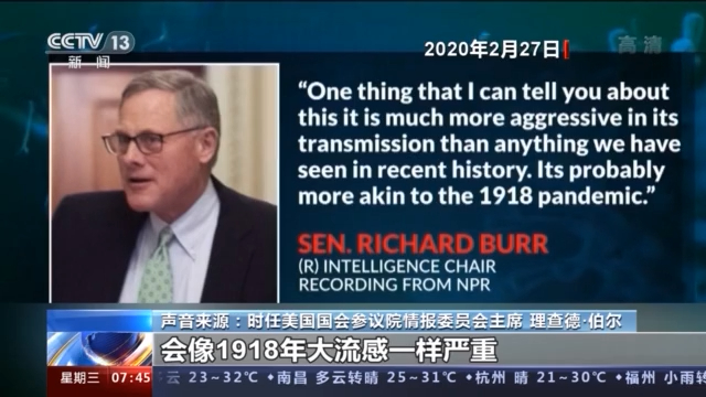 时任美国国会参议院情报委员会主席 理查德·伯尔:我能告诉你们的是, 新冠病毒的传播力在近代历史上是最强的,这次疫情很可能会像1918年大流感一样严重。