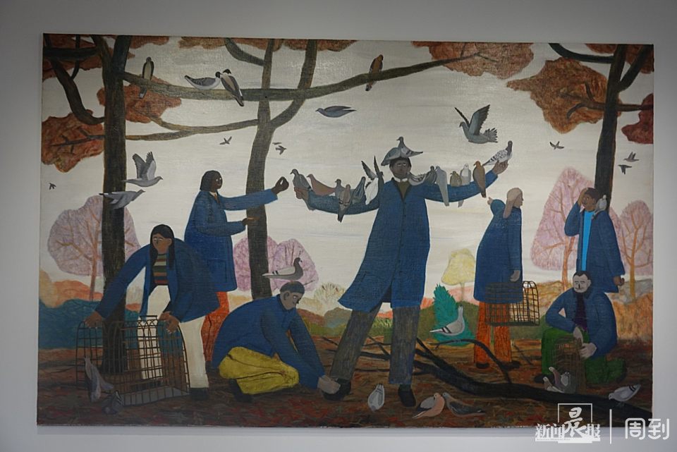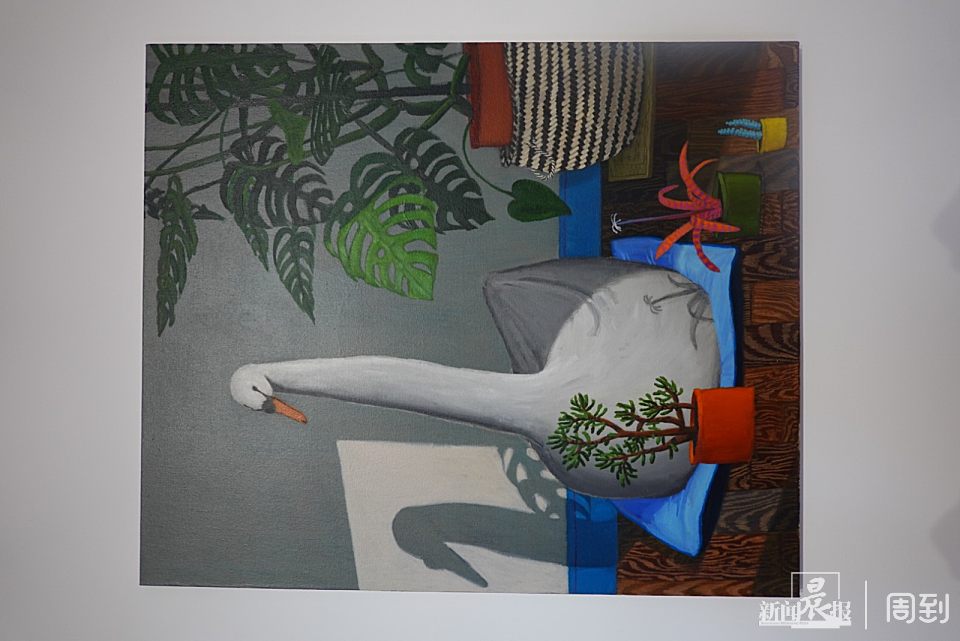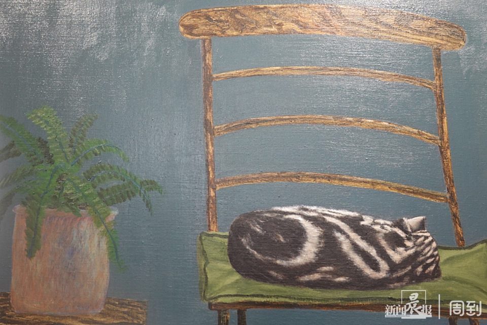 艺术家使用亚麻丙烯,描绘鸭子、鹅、猫、龟背竹和窗框即景。画作看起来很“英式田园”,也很“治愈系”,与老洋房的氛围相贴合。
