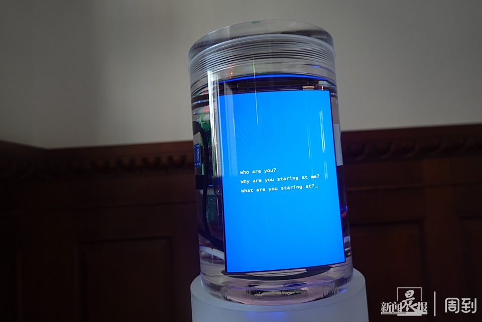丁世伟的新媒体装置非常有趣,犹如“缸中之脑”的实体化。比方说,一个蓝色的屏幕立在白色的柱子上,问你“你为什么要盯着我看”,自问“我是艺术作品、机器还是屏幕”?20组存在主义式的问题不断浮现,充满智性的趣味。
