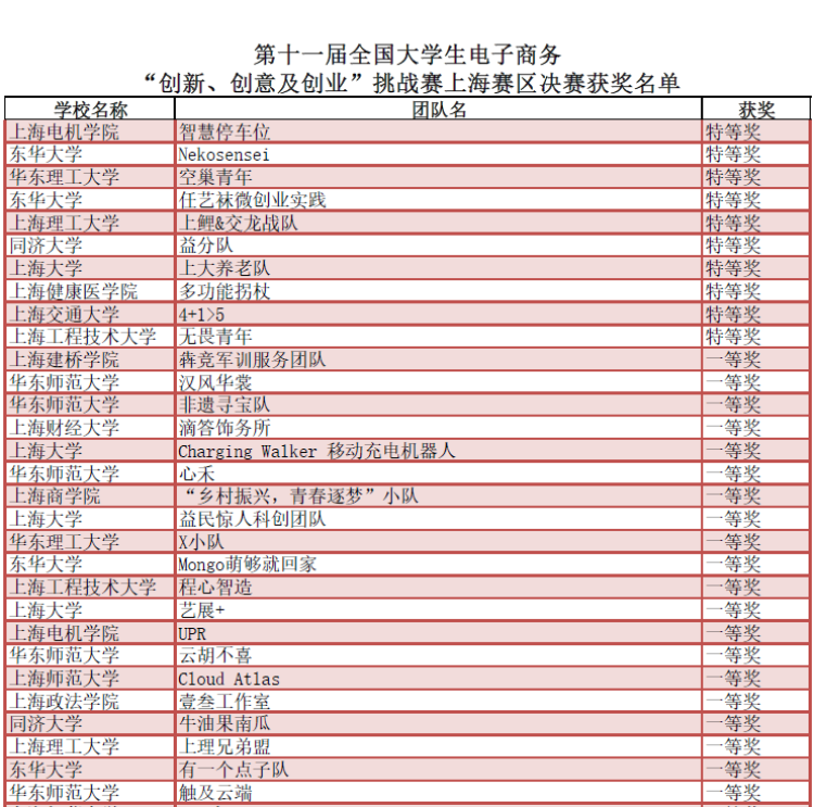 在刚刚落幕的第十一届全国大学生电子商务“创新、创意及创业”挑战赛上海赛区选拔赛上,上海电机学院“智慧停车位”团队、上海健康医学院“多功能拐杖队”、华东理工大学“空巢青年”团队以及上海交通大学“4+1>5”团队等10个团队夺得了特等奖。