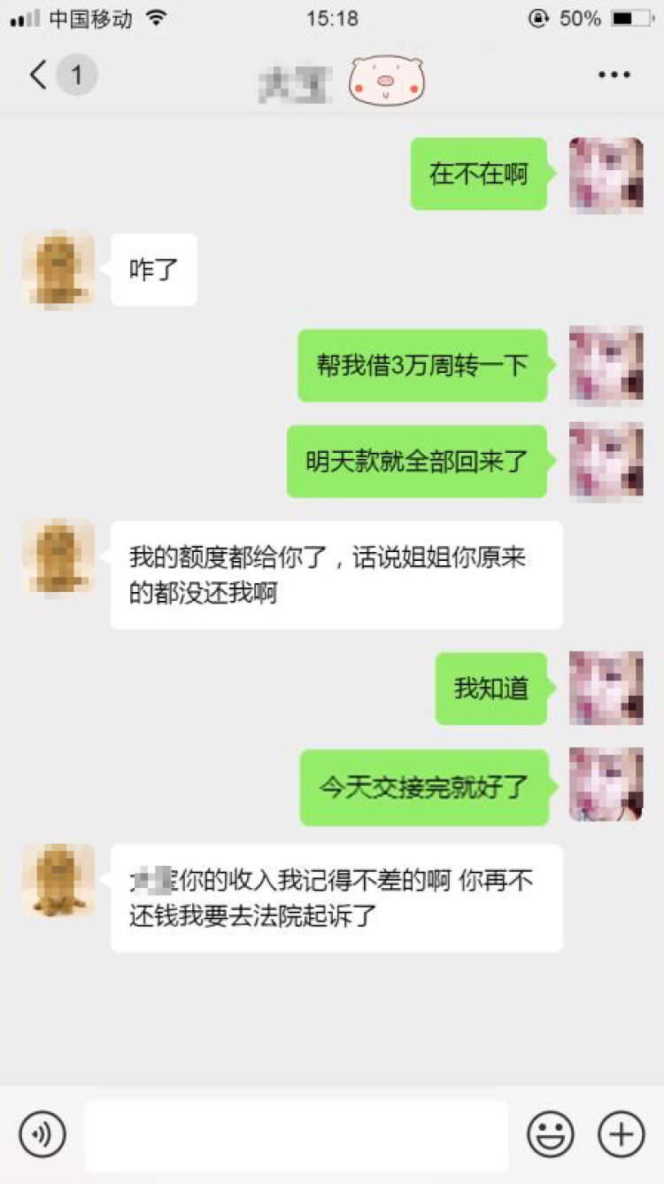 这样的聊天持续了一周,释俊发现为了给小慧转钱,自己的各种信用额度都用完了。小慧也开始冷落他。每次约她见面,都以太忙为由推脱。直到这时,释俊开始怀疑女友“大宝”,就是为了借用自己的信用借钱,才与自己在一起的。