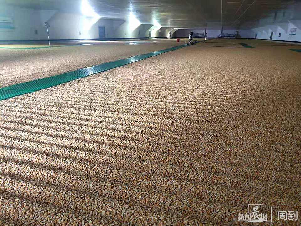 粮面上一道道条沟有何用?现场工作人员介绍:“粮食进仓后,粮面并不是平的,需要先用平整器进行平整,然后再用粮面拉钩器开出条沟,这样做主要是为了增加粮面的表面积,可以增加1.5倍的面积,有助于水分、热量散发。”
