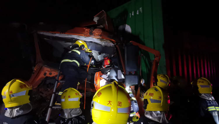 根据现场情况,消防救援人员立即实施救援,因车头被挤扁且大半部分已嵌入第二辆集卡尾部,再加上来自两侧集装箱的强大压力,使得液压破拆救援工具无法发挥作用。