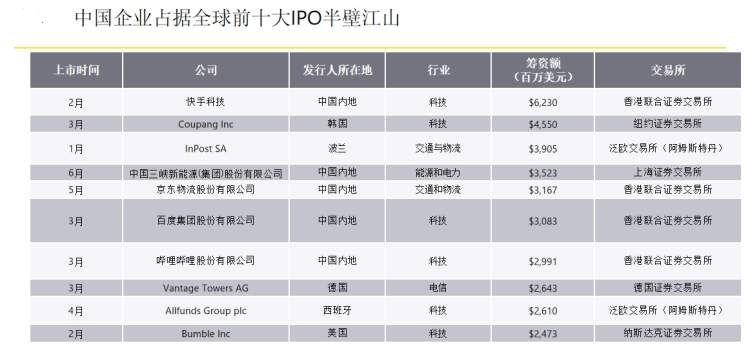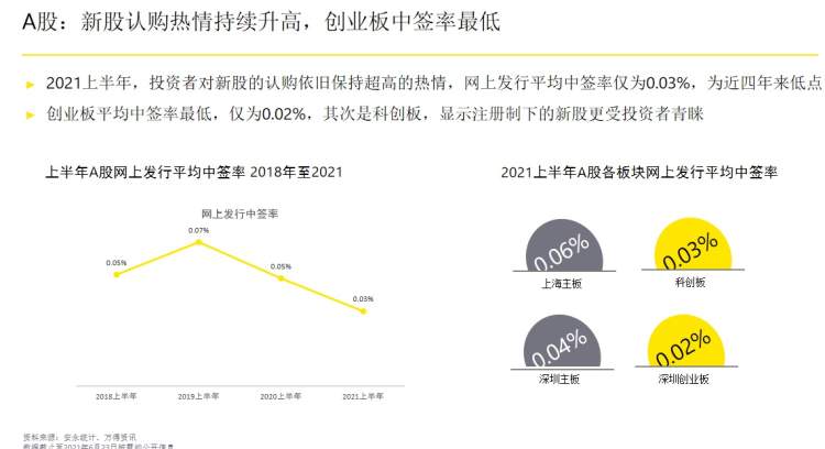 的确,安永统计显示,2021上半年A股市场新股发行网上平均中签率仅0.03%,为近四年来低点。其中创业板最低,平均中签率仅0.02%,其次是科创板的0.03%,显示注册制下的新股更受投资者青睐。中签率低也与今年上半年A股新股中小企业为主有关。但放眼全球,今年上半年前十大IPO中中国企业占半,快手科技IPO筹资额居首,三峡能源(第四)、京东物流进入前五。