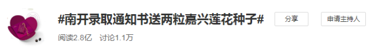6月23日,周到君的微博也被#南开录取通知书送两粒嘉兴莲花种子# 刷屏了。↓