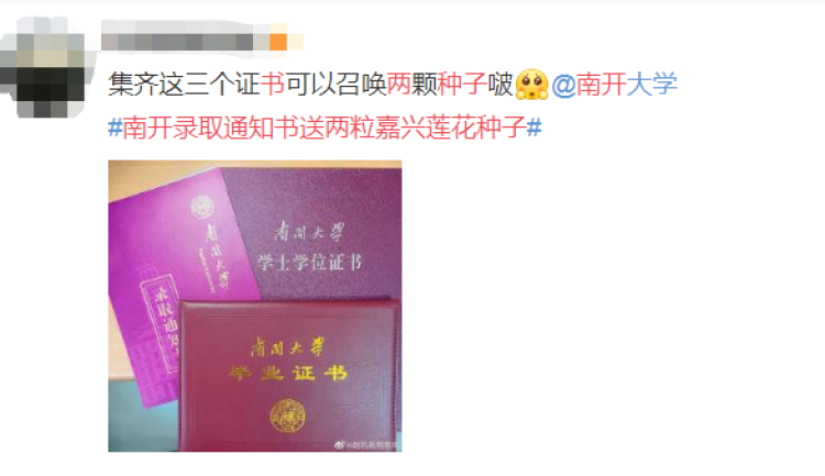 也有南开大学毕业校友晒出自己当年的录取通知书、毕业通知书和学士学位证书,“凡尔赛”地问:集齐这三个证书可以召唤两颗种子啵?