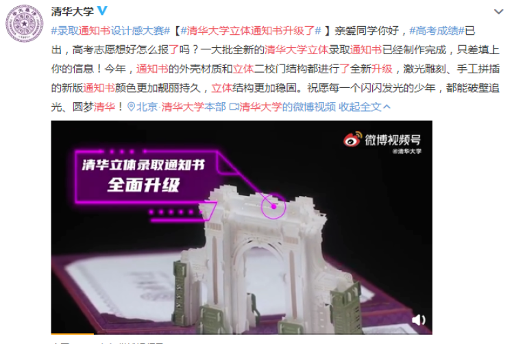 同时清华大学的官博还并表示“一大批全新的清华大学立体录取通知书已经制作完成,只差填上你的信息!”