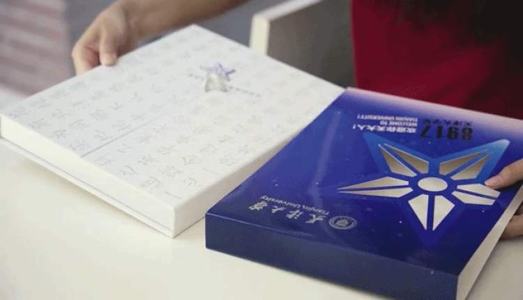 无数夜光闪耀的星星,织成深沉又静谧的星空包裹着它,“花堤蔼蔼,北运滔滔”的校歌,隐藏在星形镂空下。在通知书的开合处,有一颗可温感变色的“天津大学星”,当用手触摸拽动它的一瞬间,你的体温即可让它闪耀开启。