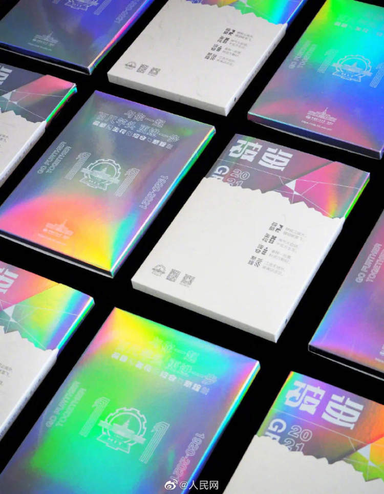 哈工业学的录取通知书的主视觉运用了镭射材质的呈现特点。这种材质表面不发光,但在光的照射下,每一个角度都会呈现出不同的色彩。