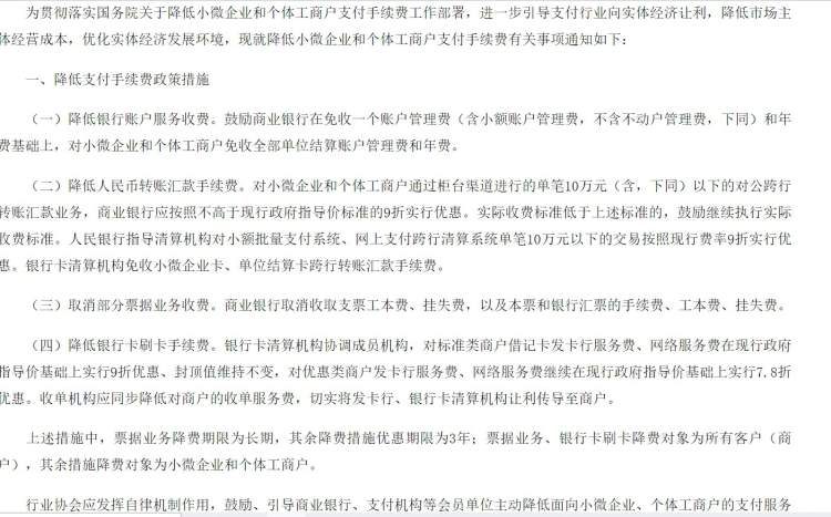 上述措施中,票据业务降费期限为长期,其余降费措施优惠期限为3年;票据业务、银行卡刷卡降费对象为所有客户(商户),其余措施降费对象为小微企业和个体工商户。