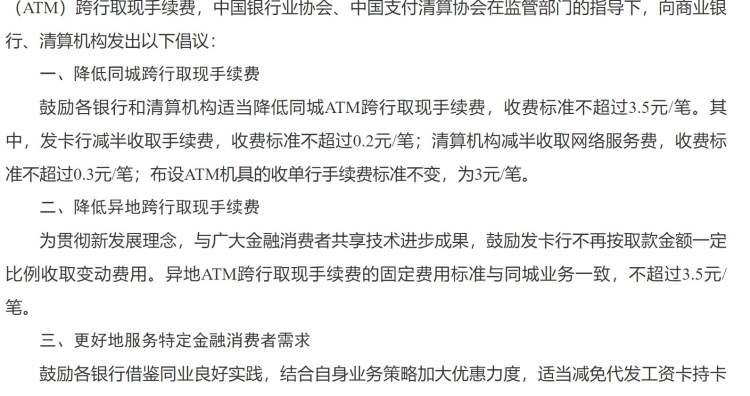 6月25日,中国银行业协会、中国支付清算协会联合发布《关于降低自动取款机(ATM)跨行取现手续费的倡议书》。同城ATM跨行取现手续费标准下调至每笔不超过3.5元;其中,发卡行减半收取手续费,收费标准不超过0.2元/笔;清算机构减半收取网络服务费,收费标准不超过0.3元/笔;布设ATM机具的收单行手续费标准不变,为3元/笔。