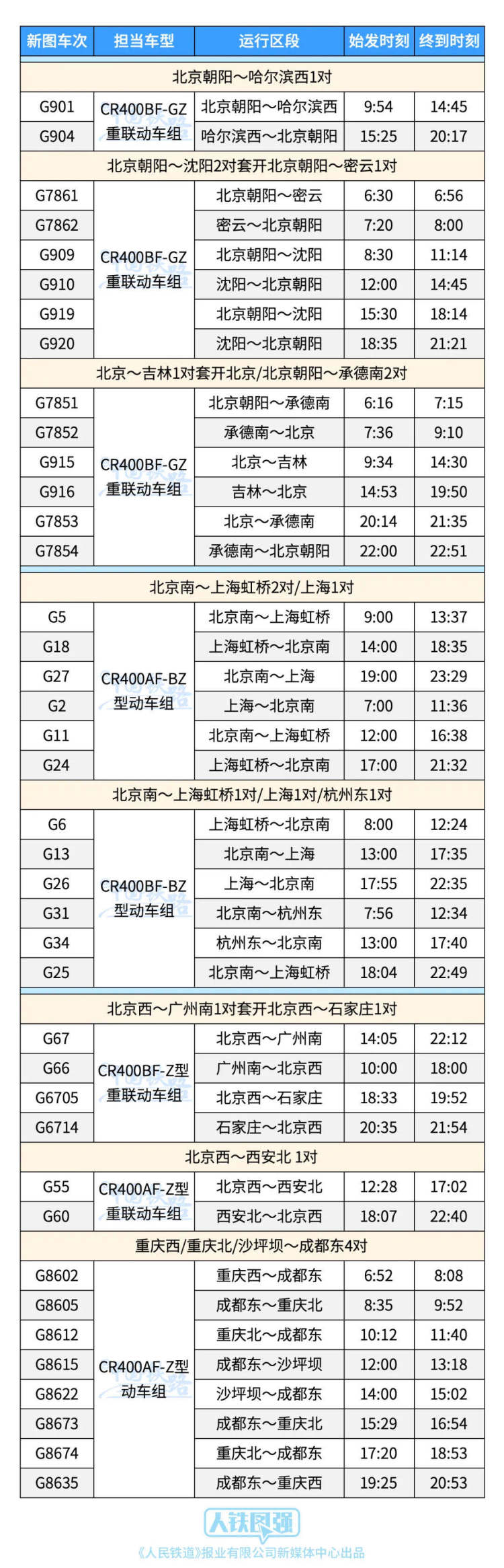 今天,中国铁路上海局集团有限公司辖区范围内,上海、杭州两地经京沪高铁至北京南站,安排了6对高铁列车使用复兴号智能动车组车底运行,具体车次为:上海—北京南G2/G27次1对、G26/G13次1对,上海虹桥—北京南G18/G5次1对、G6/G25次1对、G24/G11次1对,杭州东—北京南G34/G31次1对。