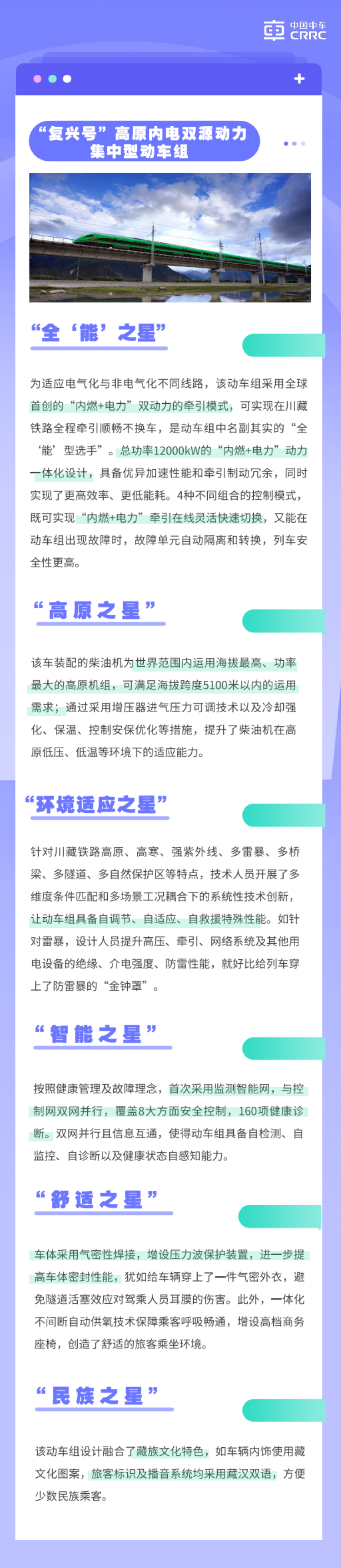 6月25日10时30分,随着一声汽笛长鸣,“复兴号”高原内电双源动力集中型动车组从拉萨站驶出。至此,中国中车研制的“复兴号”动车组实现了在祖国大陆的全覆盖。该动车组采用整列一体化设计,两端分别挂电力动力车和内燃动力车,可在电气化和非电气化线路间自由切换、贯通运用,编组为12辆,设一等、二等和商务车厢,定员755人,创新采用弥散和分布式相结合的方式连续供氧,为旅客提供良好乘车体验,完全适应高海拔、连续长大隧道环境。