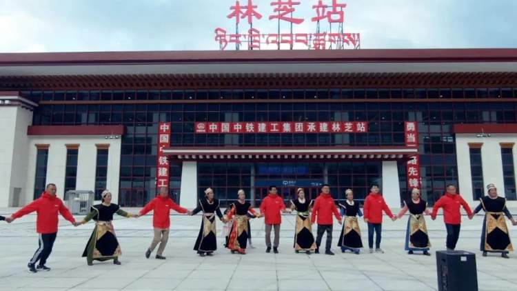 ▲铁路建设者与藏族同胞载歌载舞