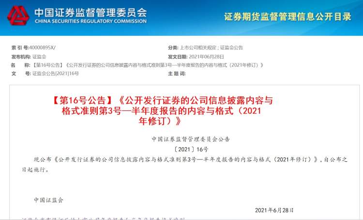 6月28日,证监会发布《公开发行证券的公司信息披露内容与格式准则第3号—半年度报告的内容与格式(2021年修订)》,《公开发行证券的公司信息披露内容与格式准则第2号—年度报告的内容与格式(2021年修订)》,自公布之日起施行。这意味着,今年的半年报将出现一些新变化。