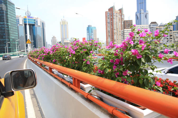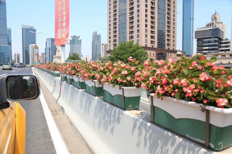 近日,驾车出行的广大市民欣喜地发现,本市内环高架路、延安高架路、南北高架路等主要高架道路护栏上,被五彩斑斓的花装点一新,市民打开车窗就能感受到扑鼻而来的花香。
