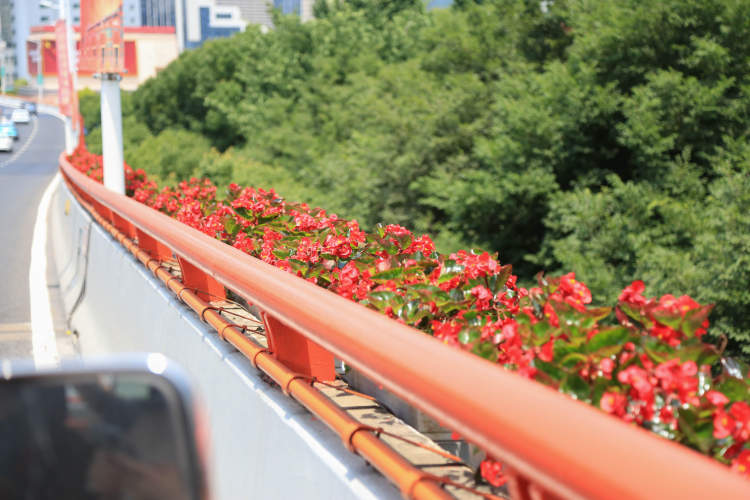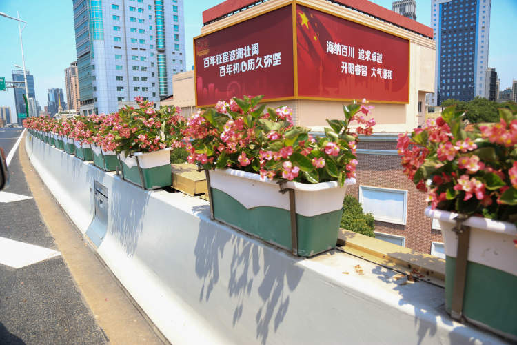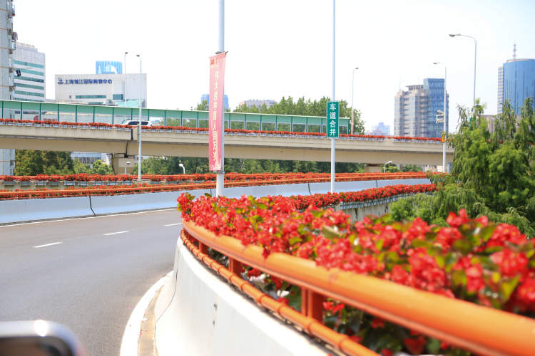 此次整体高架花盆绿化以红色为主题色,运用多层次红色,局部点缀粉色、紫色植物,以“红色律动”作为上海高架绿化主题,展现热烈而活力的城市精神。
