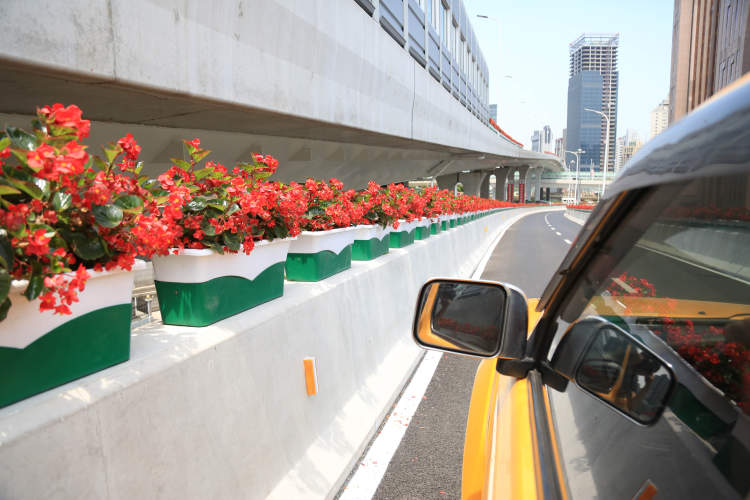 “七一”前,市道路运输局、市道运中心对上海市区“申字形”高架沿口悬挂绿化进行了更新。“三角梅”、“超级海棠”、“彩叶草”等多个品种近七万盆花被摆放在高架道路护栏上,申城的高架道路瞬间变成了“花的海洋”。