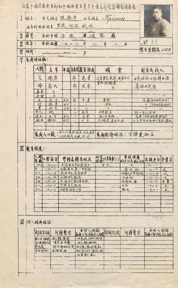 图片说明:陈乔年履历(源自@央视国家记忆)