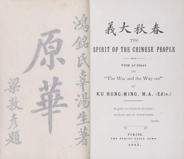辜鸿铭所著《春秋大义》英文名为“The Spirit of the Chinese People”,1915年由“北京每日新闻社”首版,它是一本试图向西方世界阐明中国人的精神,并揭示中国文明价值的英文书。