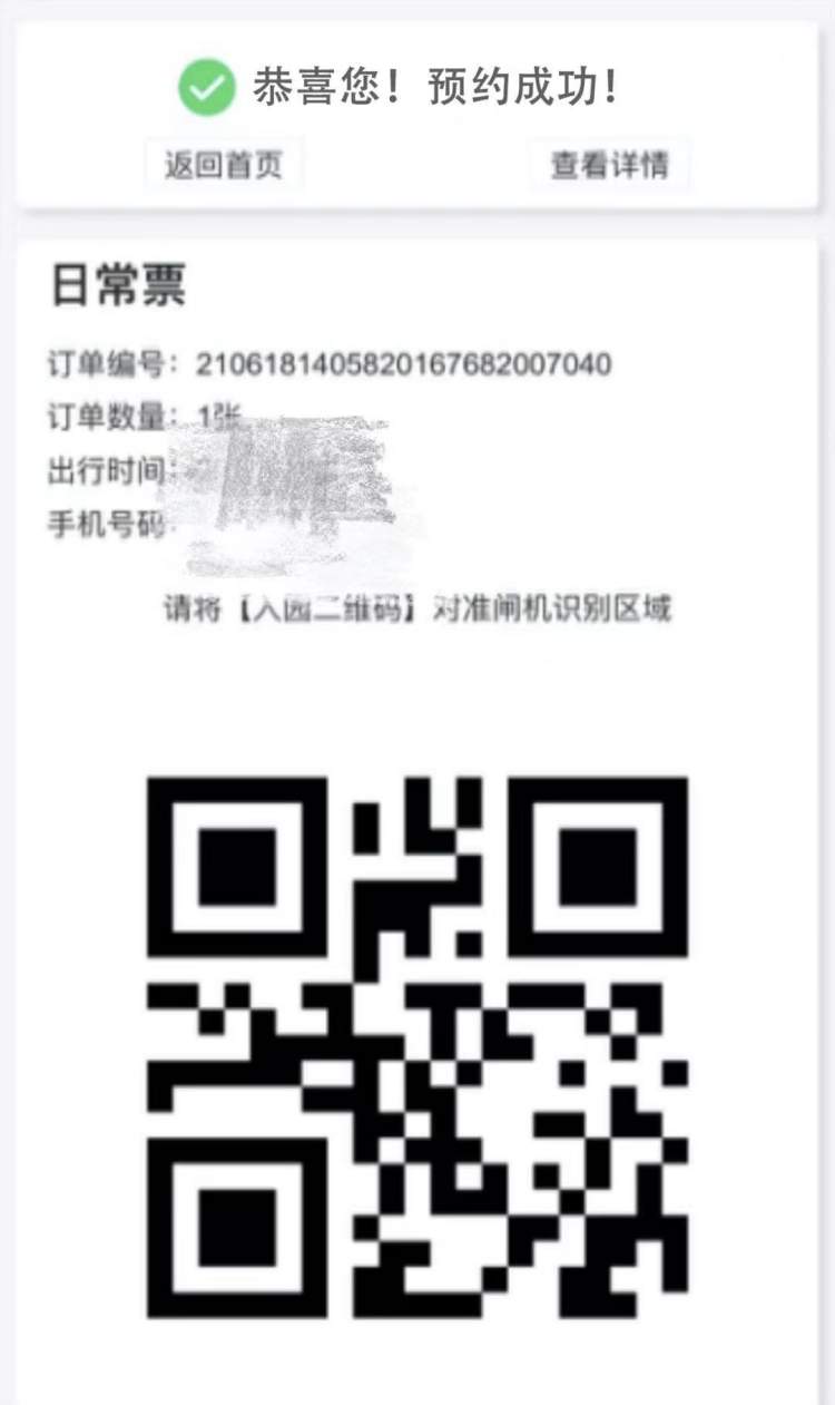 6.预约成功,接收入园二维码,预约成功后可凭二维码直接扫码入园,也可在园区检票处刷身份证入园。