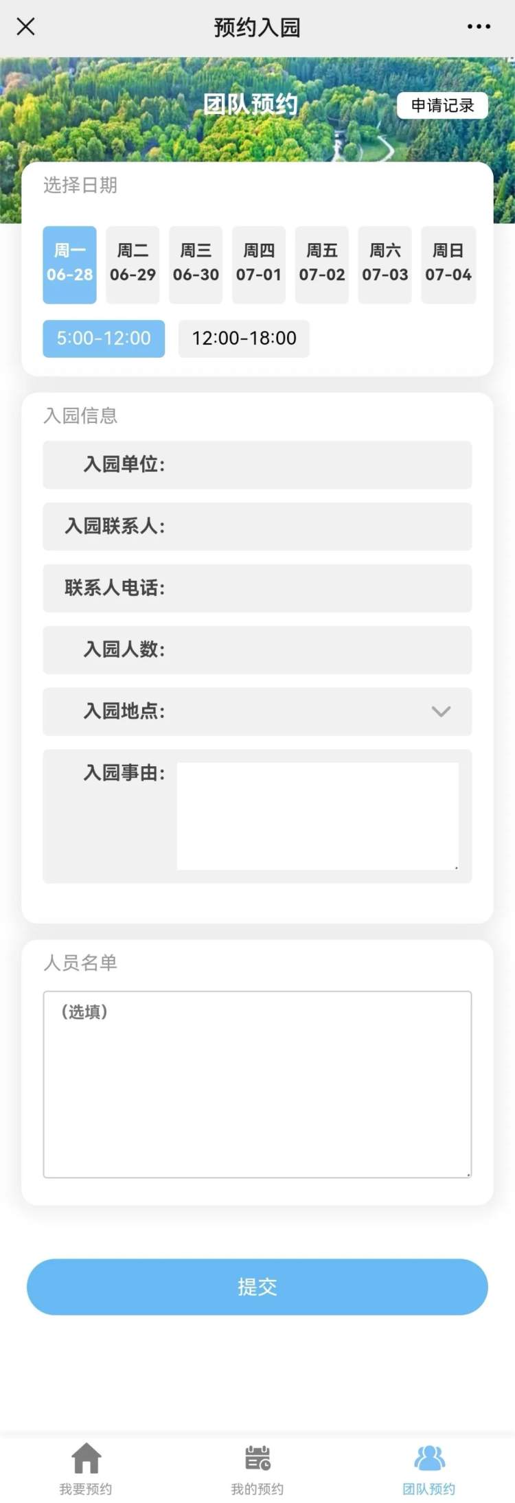 (提交申请后可在右上角“申请记录”中查看预约进度)