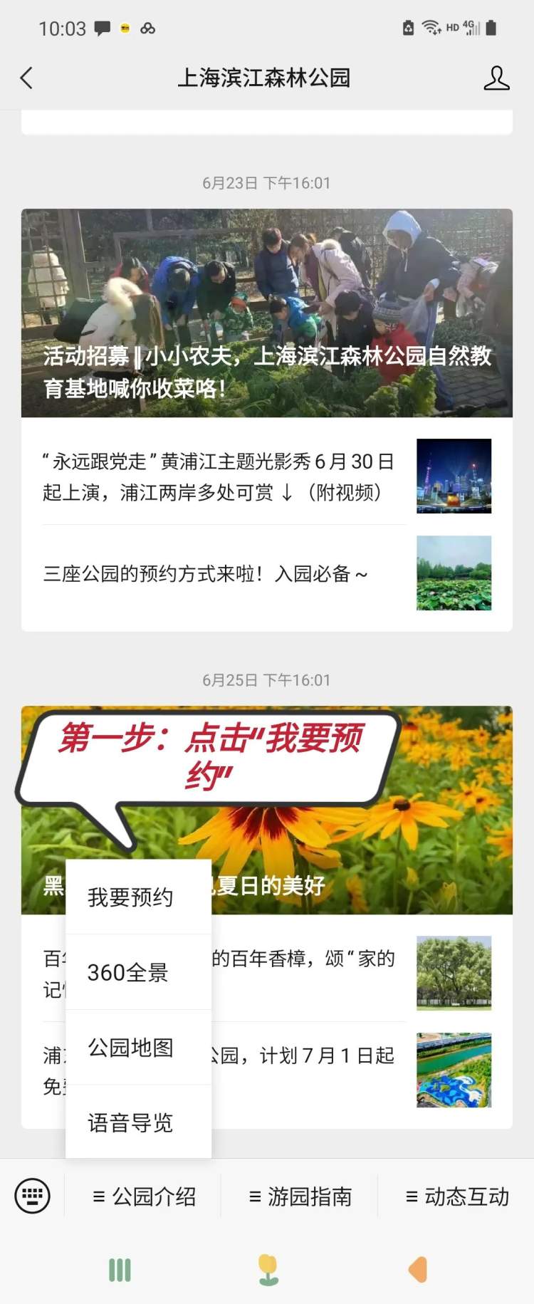 1.在公众号菜单栏点击“公园介绍”选择“我要预约”。