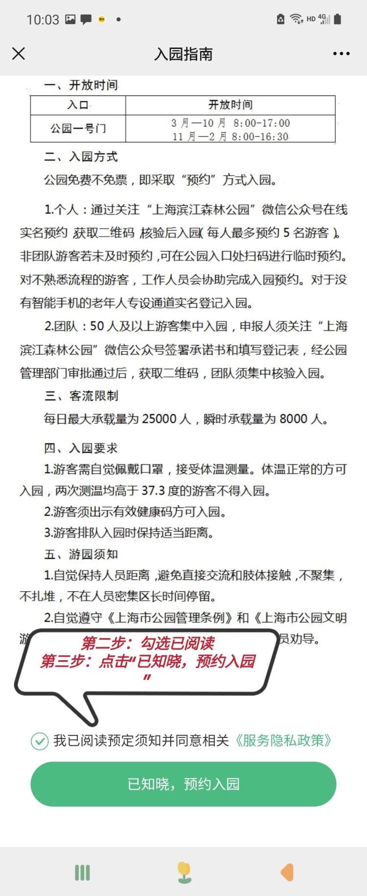 2.知悉相关须知后勾选“我已阅读预订须知”,点击“已知晓,预约入园”。